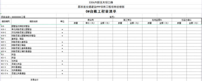 一個(gè)項(xiàng)目或一個(gè)合同段的臺(tái)賬由n條可以獨(dú)立計(jì)量的工程結(jié)構(gòu)(單元)組成,一般情況下一條臺(tái)賬應(yīng)包含子目號(hào)、子目名稱(chēng)、單位、工程數(shù)量、單價(jià)、合價(jià)、里程樁號(hào)、工程部位描述、圖紙編號(hào)、備注說(shuō)明等。